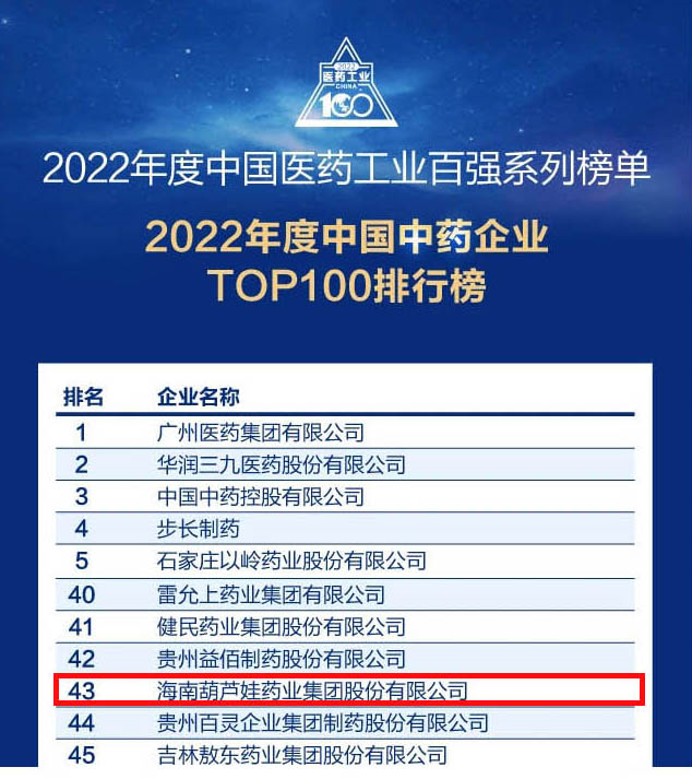 BG真人药业集团连续4年荣登“中国中药企业TOP100排行榜”,排名上升至第43位